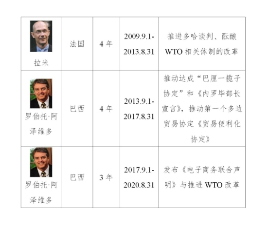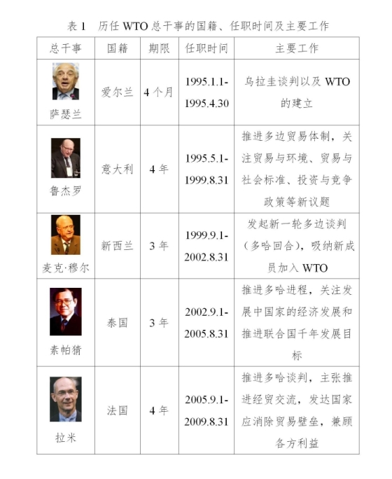 在GATT时期,总干事主要负责在贸易谈判中发挥协调作用,推进关税逐步降低。到了WTO时期,总干事负责的工作更多,要顾及到贸易谈判、争端解决和贸易政策审议等诸多领域。WTO历任总干事的国籍、任职时间和主要工作如表1所示。