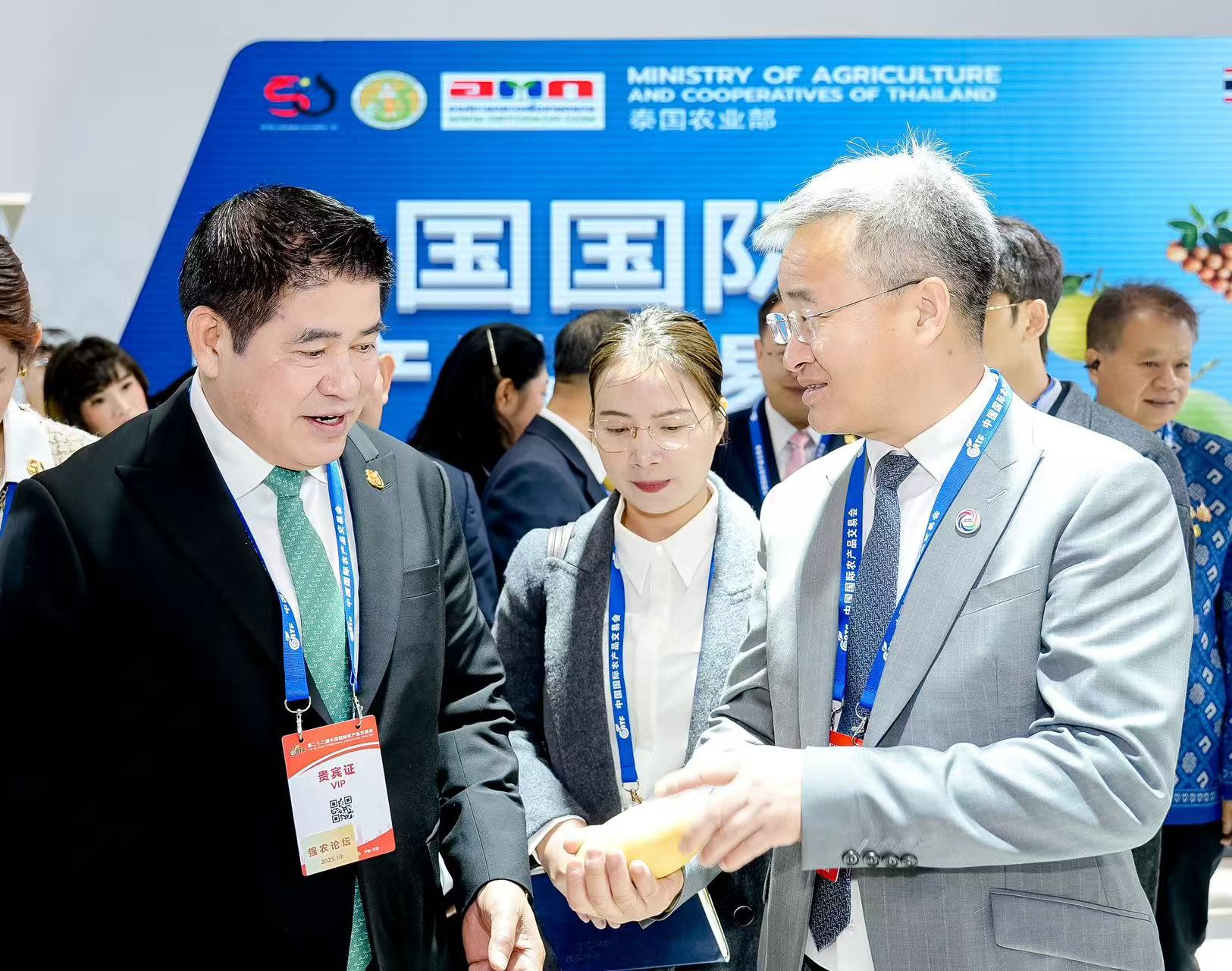 本届农交会国际展区围绕“开放发展 合作共赢”主题,设置主宾国泰国馆、五大洲特色国家馆、中国—上合组织农业合作馆、国际美食街区等四大版块,国际化水平大幅提升,成效亮点集中凸显。规模大,展商全面覆盖五大洲,展区汇聚全球19个国家的66家企业,参展国家数量较上届增长27%,近百家国际采购商参展寻觅商机。规格高,主宾国泰国派出由副总理兼农业与合作社部部长塔玛纳・蓬抛率领的近60人代表团参展,代表团规格之高、人数之多创下农交会历史之最。泰国馆开馆仪式上,韩俊部长、江文胜副部长及天津市市长张工等与泰方嘉宾共同剪彩,场面隆重热烈。