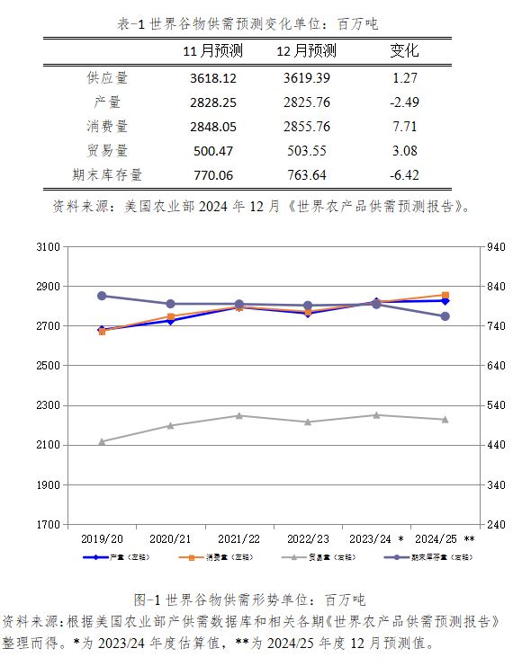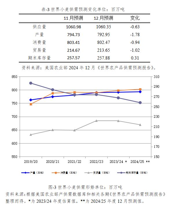 2024/25年度世界小麦供应量预计为10.60亿吨,较2023/24年度估算值减少491万吨,比上月预测值下调63万吨。主要原因是期初库存的增加量不足以抵消产量的下降。