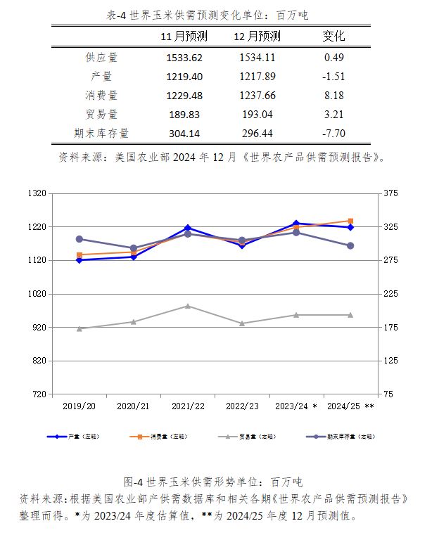 2024/25年度世界玉米期末库存预计为2.96亿吨,较2023/24年度估算值减少1978万吨,比上月预测值下调770万吨。主要是中国、欧盟和印度尼西亚期末库存减少。