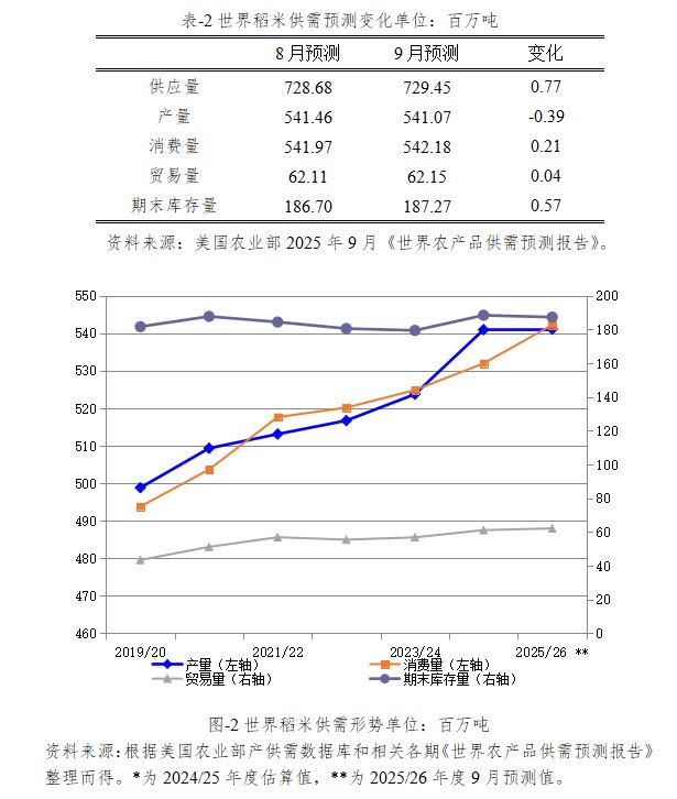 2025/26年度世界稻米产量预计为5.41亿吨,较2024/25年度估算值增加14万吨,比上月预测值下调39万吨。