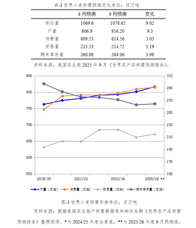 2025/26年度世界小麦期末库存预计为历史最低水平的2.64亿吨,较2024/25年度估算值增加164万吨,比上月预测值上调398万吨。