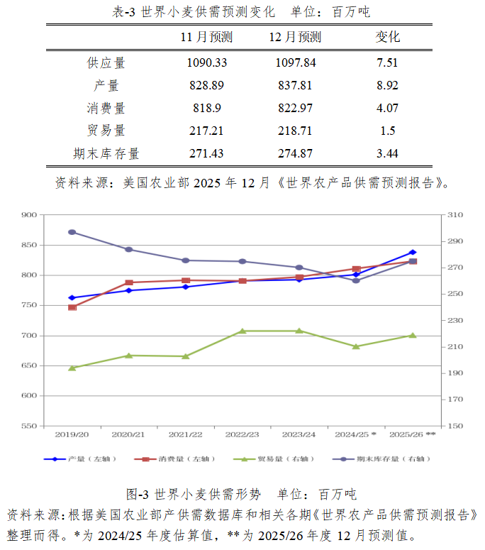 2025/26年度世界小麦产量预计为8.38亿吨,较2024/25年度估算值增加3704万吨,比上月预测值上调892万吨。
