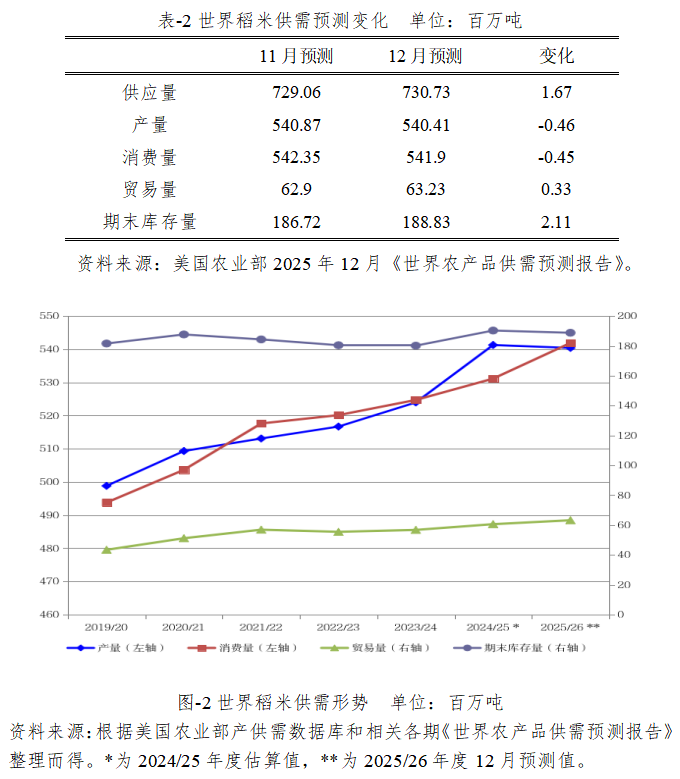2025/26年度世界稻米产量预计为5.40亿吨,较2024/25年度估算值减少87万吨,比上月预测值下调46万吨。下调的主要原因是印度产量的增加仅部分抵消了马达加斯加和菲律宾产量的减少。